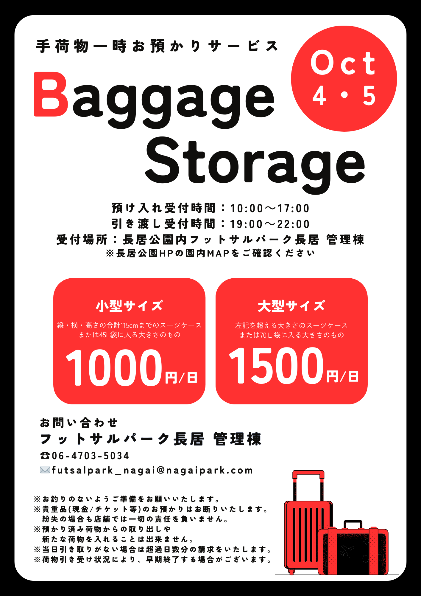 長居公園内のフットサルパーク長居(管理棟)にて荷物預かりサービスを実施しますので、ぜひご活用ください。