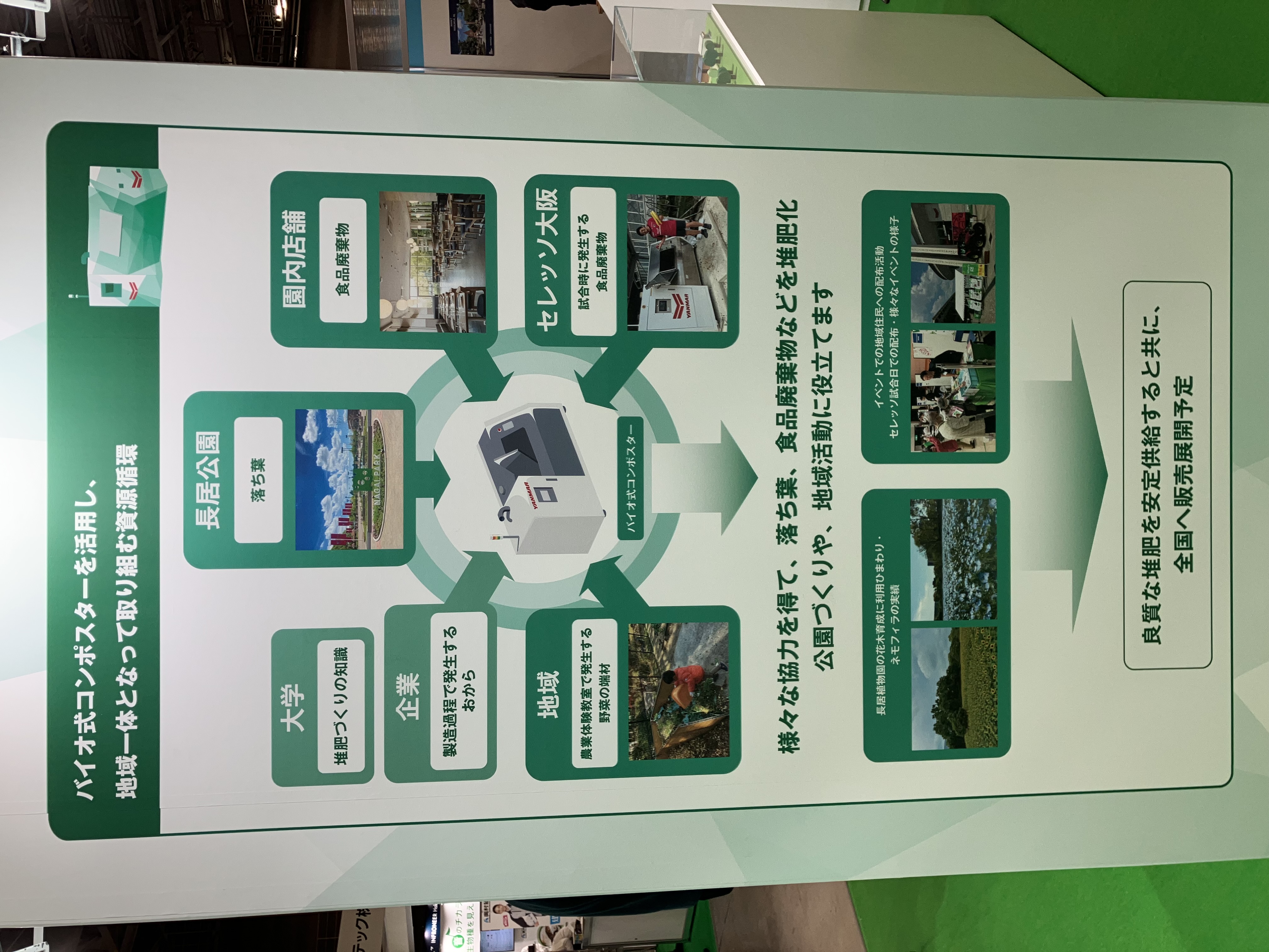 さらに、公園内に設置している食品廃棄物を堆肥化するヤンマーのバイオ式コンポスターの実機を展示し、資源循環の取り組みをご紹介しました。