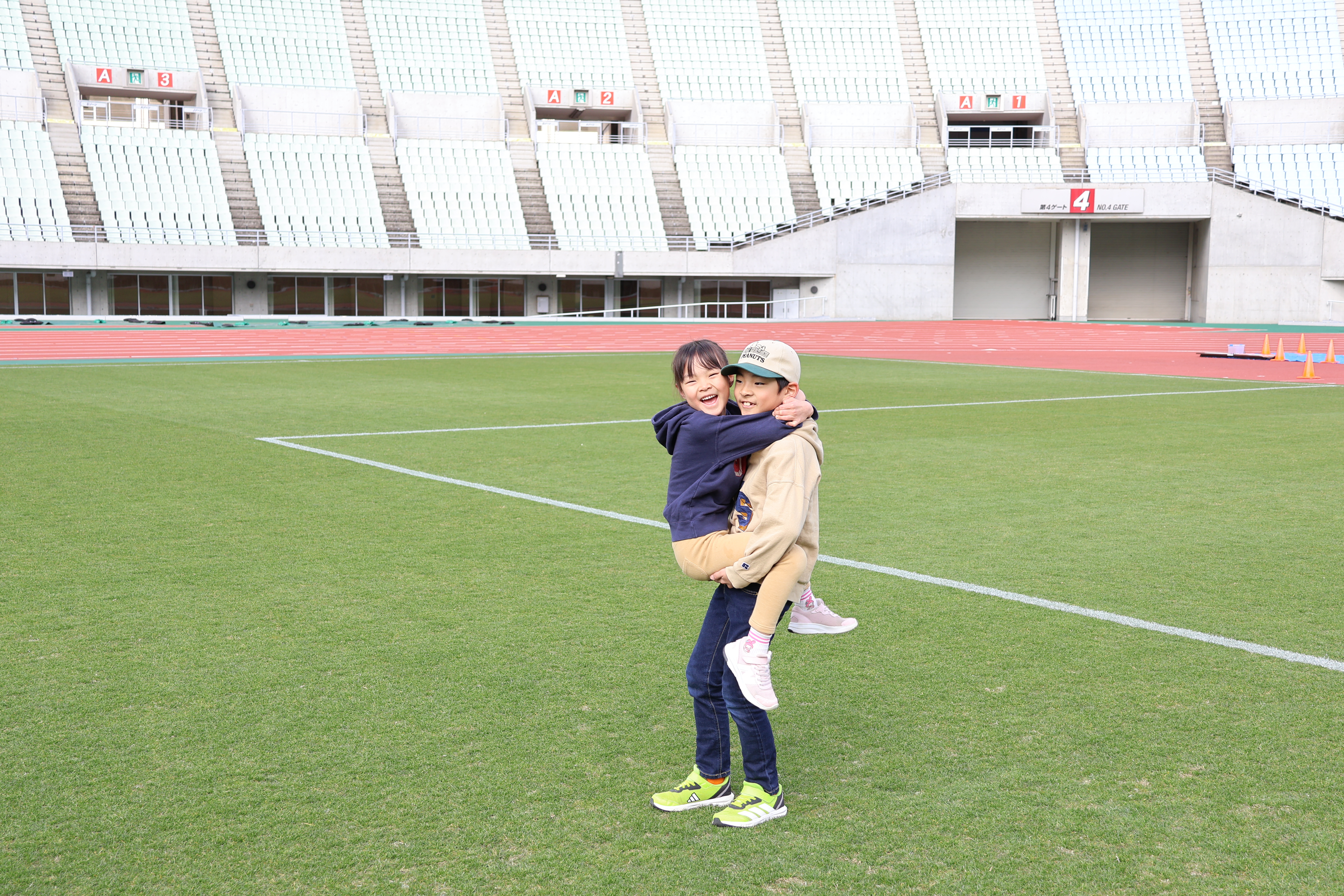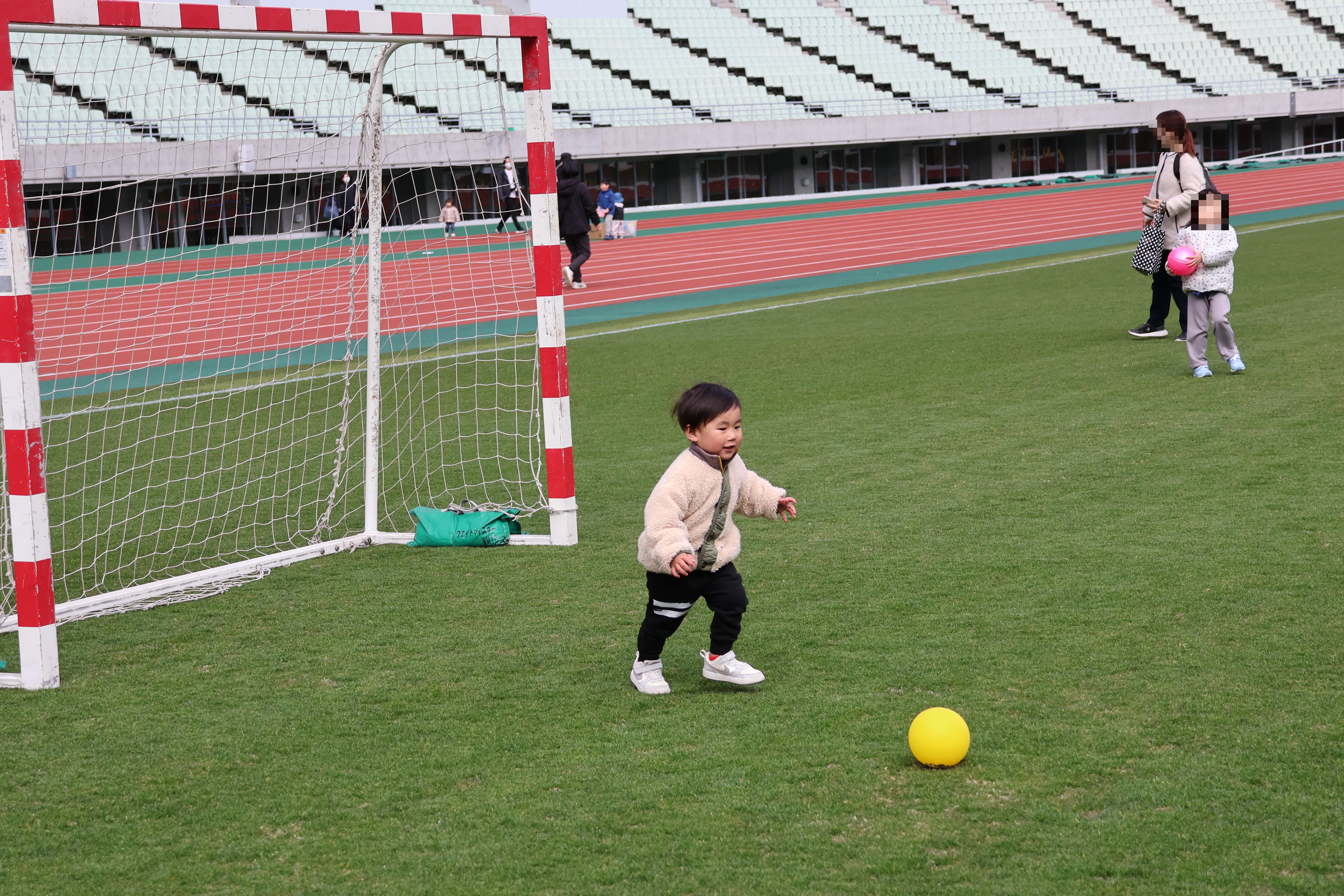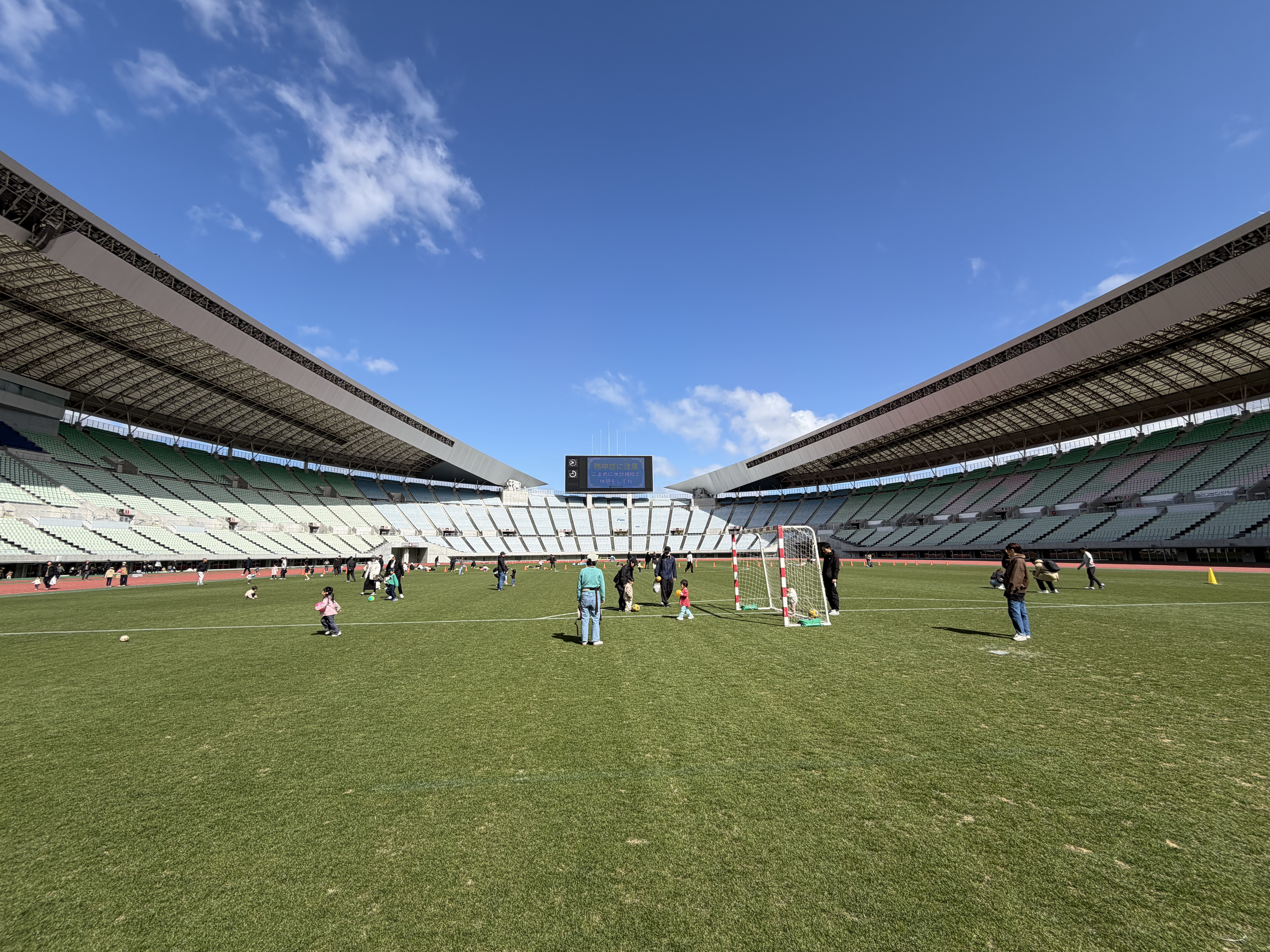 春の訪れを感じる青空の下、スタジアムにはたくさんの親子連れが集まり、思い思いにのびのびと過ごしていました。