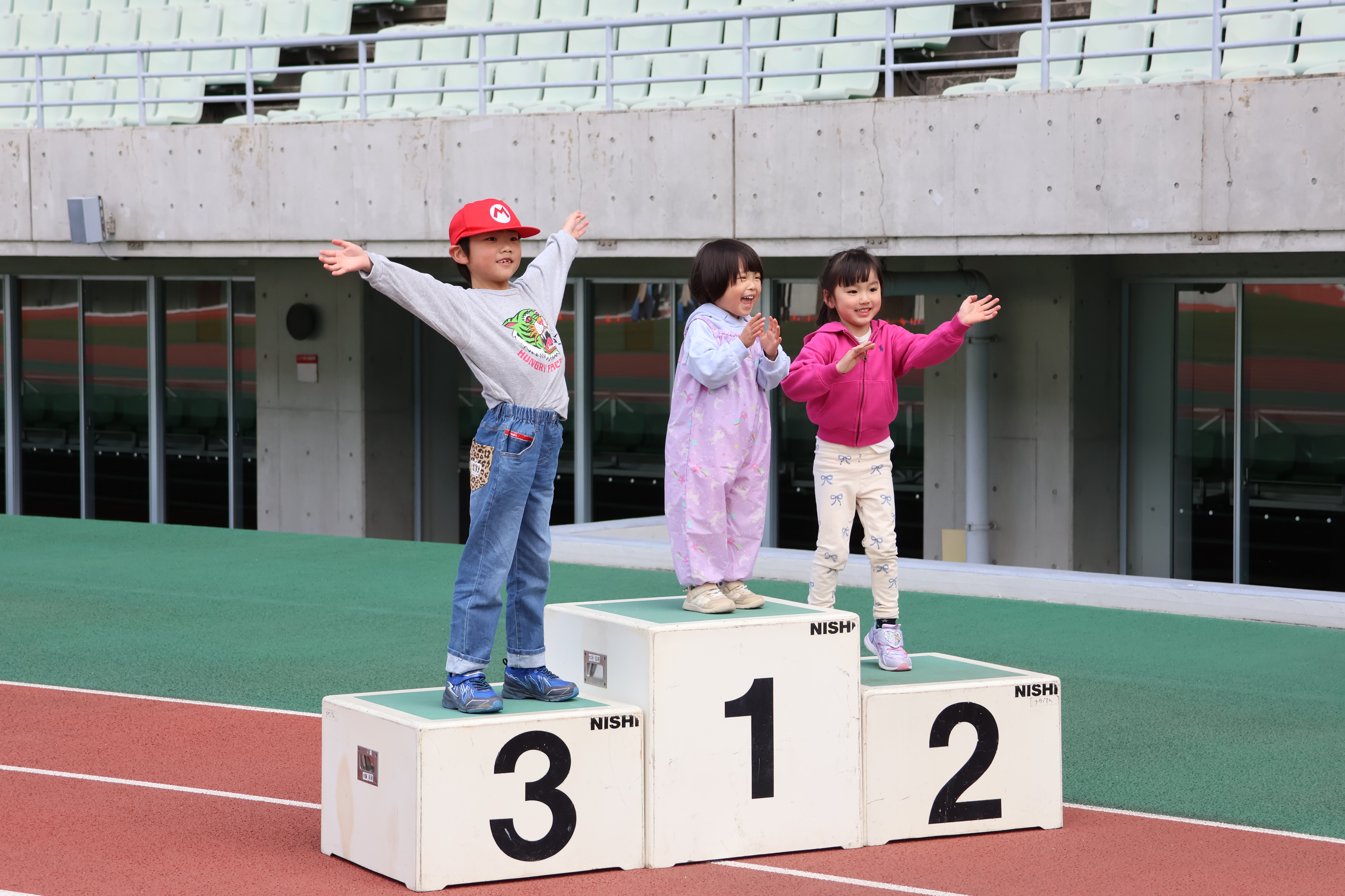 ・表彰台で記念撮影をする子どもたち
