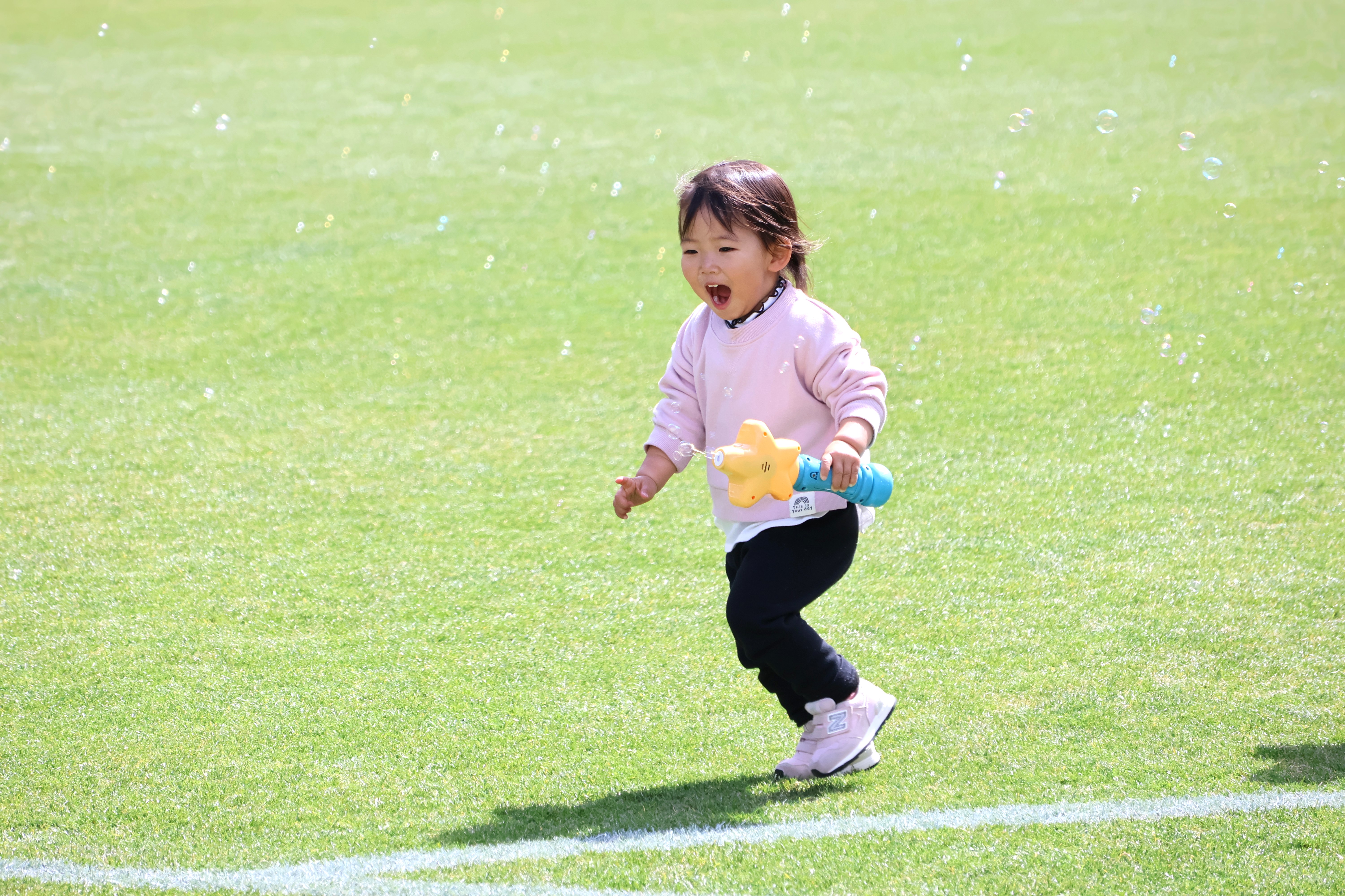 トラック脇の走り幅跳び用の砂場では子どもたちが砂遊びを楽しみ、トラック内では紙飛行機を作って飛ばしたり、設置したシャボン玉の機械や持参のものに夢中になる様子も見られました。